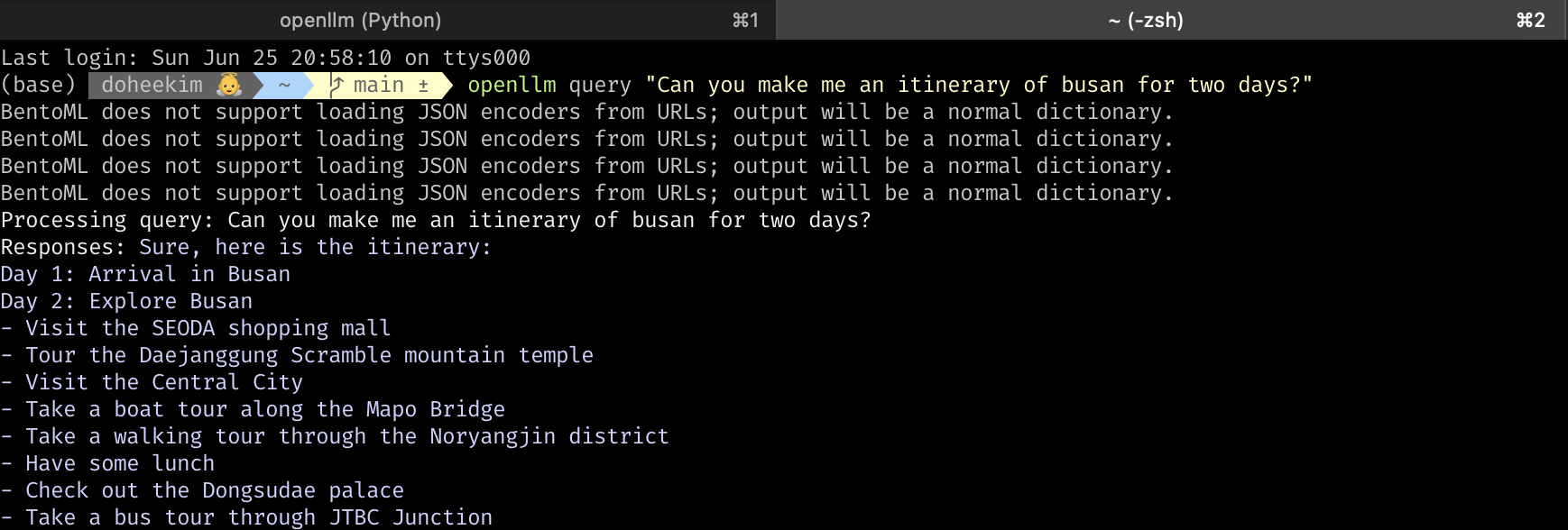 - OpenLLM은 사용자 데이터를 모은다고 한다. 내 데이터가 공유되는게 싫다면 "export OPENLLM_DO_NOT_TRACK=true"를 이용하여 사용 트래킹을 끌 수 있다고 한다.